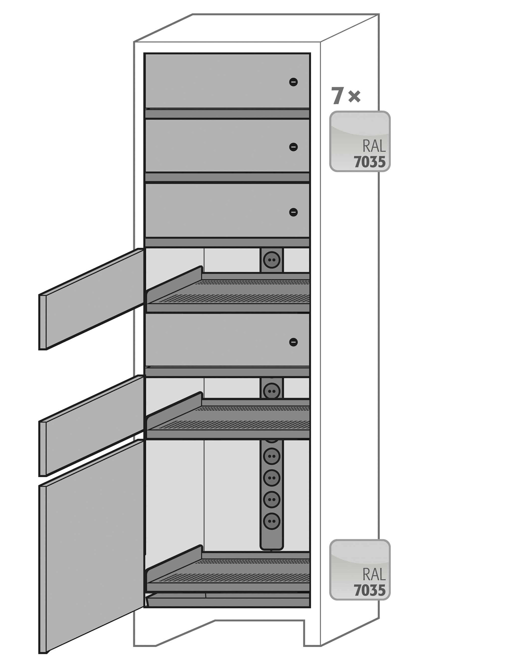 - 1 x værdibokssystem bokssystemet indeholder 7 metalbokse (6x højde=ca.170mm, 1x højde=ca.360mm) samt et bundkar. Hver boks har adgang til mindst 1 stikkontakt og har eget nøglepar. Desuden medfølger ved levering en masternøgle, der kan åbne alle de 7 bokse. Der vedlægges et sæt klistermærker samt 2 sæt nøglemærker (nummereret 1-7).