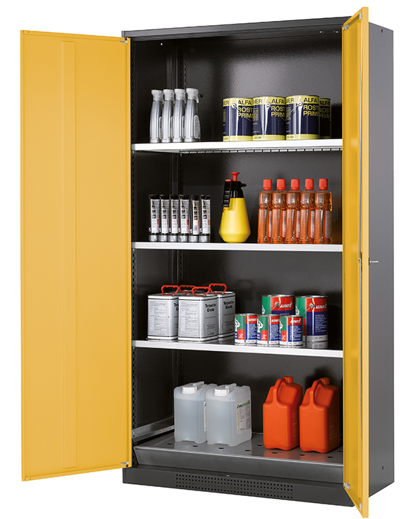 Korpusfarve antracitgrå (RAL 7016), med fløjdøre i Signalgul (RAL 1004), udstyret med 3 x hylde, 1 x hulplade indsats, 1 x bundkar (stålplade galvaniseret)