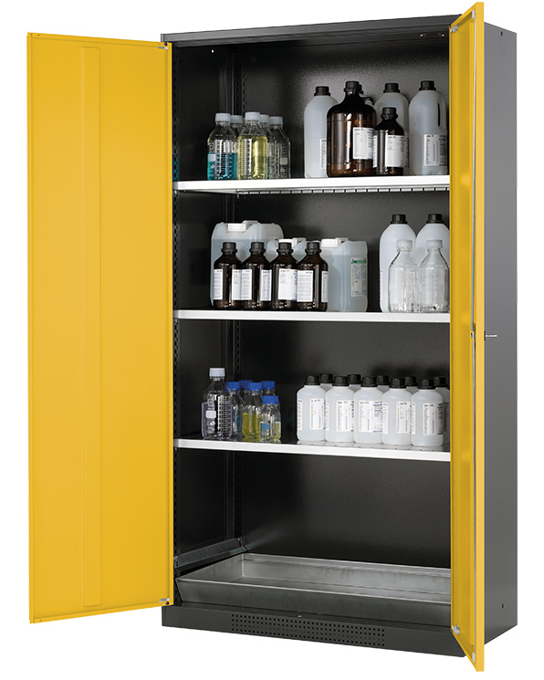 Korpusfarve antracitgrå (RAL 7016), med fløjdøre i Signalgul (RAL 1004), udstyret med 3 x hylde, 1 x bundkar (stålplade galvaniseret)