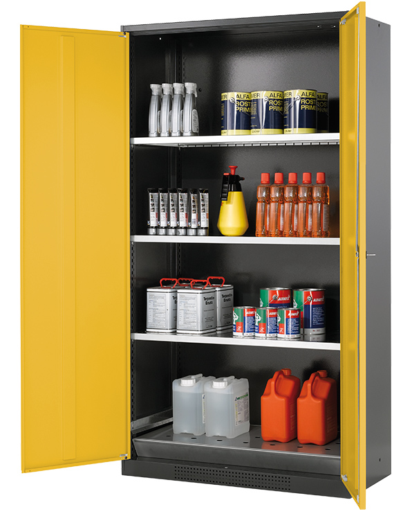 Korpusfarve antracitgrå (RAL 7016), med fløjdøre i Signalgul (RAL 1004), udstyret med 3 x hylde, 1 x hulplade indsats, 1 x bundkar (stålplade galvaniseret)