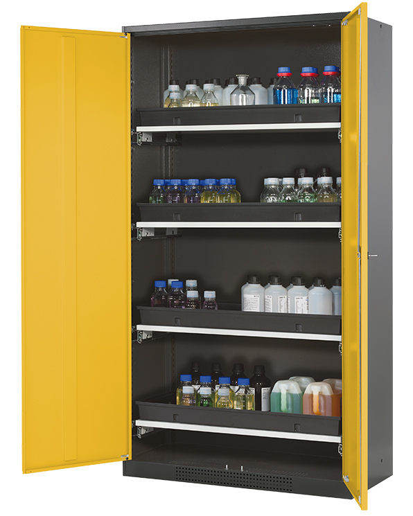 Korpusfarve antracitgrå (RAL 7016), med fløjdøre i Signalgul (RAL 1004), udstyret med 4 x udtrækskar (stålplade/polypropylen pulver lakeret)