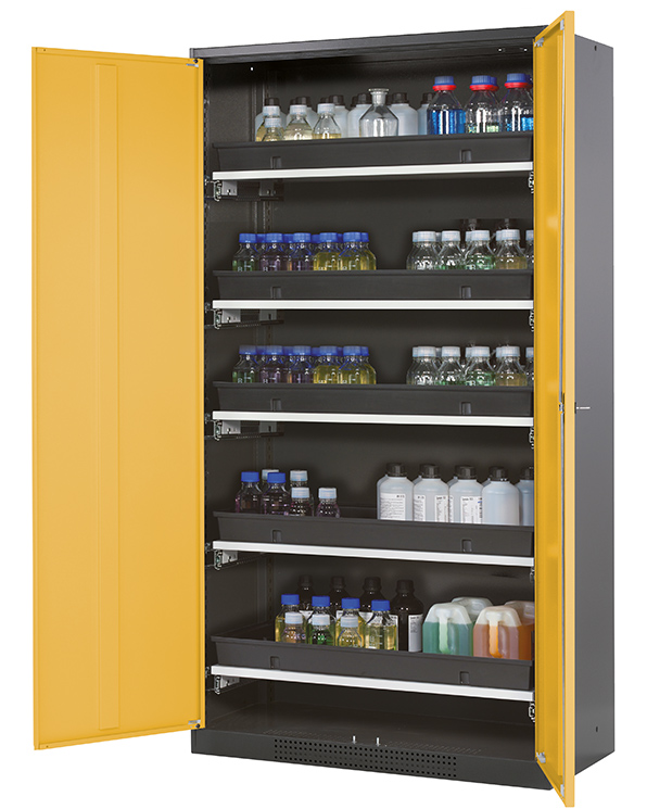 Korpusfarve antracitgrå (RAL 7016), med fløjdøre i Signalgul (RAL 1004), udstyret med 5 x udtrækskar (stålplade/polypropylen pulver lakeret)