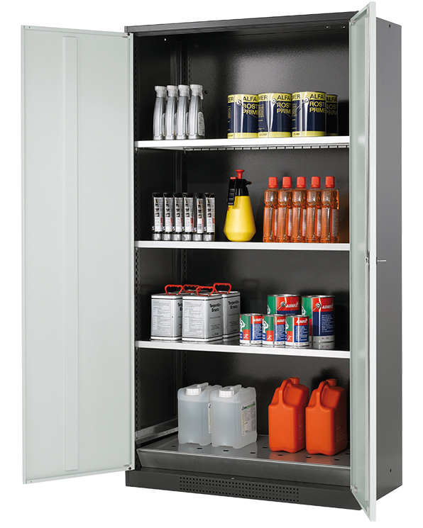 Korpusfarve antracitgrå (RAL 7016), med fløjdøre i Lys grå (RAL 7035), udstyret med 3 x hylde, 1 x hulplade indsats, 1 x bundkar (stålplade galvaniseret)