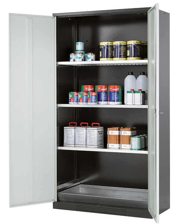 Korpusfarve antracitgrå (RAL 7016), med fløjdøre i Lys grå (RAL 7035), udstyret med 3 x hylde, 1 x bundkar (stålplade galvaniseret)