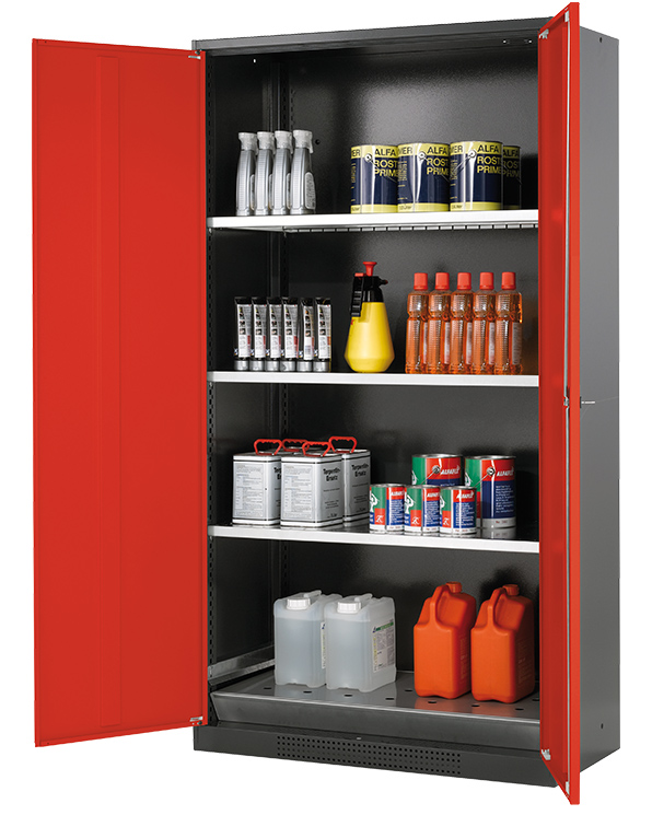 Korpusfarve antracitgrå (RAL 7016), med fløjdøre i Trafik rød (RAL 3020), udstyret med 3 x hylde, 1 x hulplade indsats, 1 x bundkar (stålplade galvaniseret)