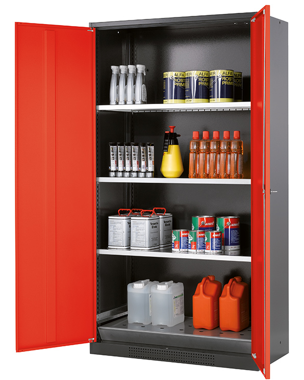 Korpusfarve antracitgrå (RAL 7016), med fløjdøre i Trafik rød (RAL 3020), udstyret med 3 x hylde, 1 x hulplade indsats, 1 x bundkar (stålplade galvaniseret)