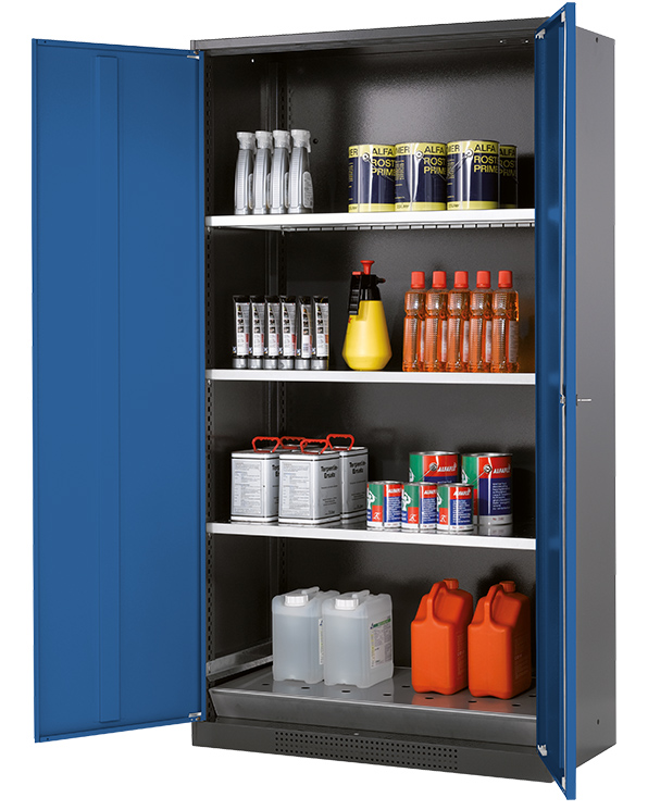 Korpusfarve antracitgrå (RAL 7016), med fløjdøre i Ensianblå (RAL 5010), udstyret med 3 x hylde, 1 x hulplade indsats, 1 x bundkar (stålplade galvaniseret)