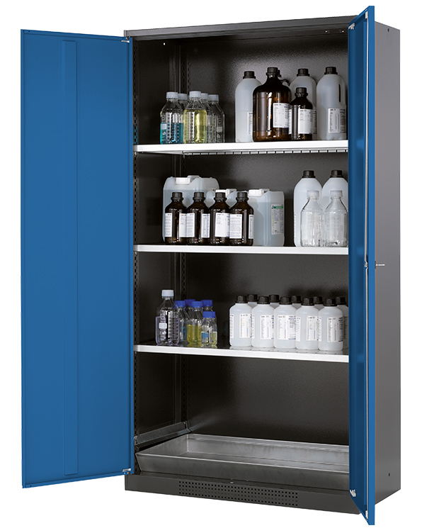 Korpusfarve antracitgrå (RAL 7016), med fløjdøre i Ensianblå (RAL 5010), udstyret med 3 x hylde, 1 x bundkar (stålplade galvaniseret)