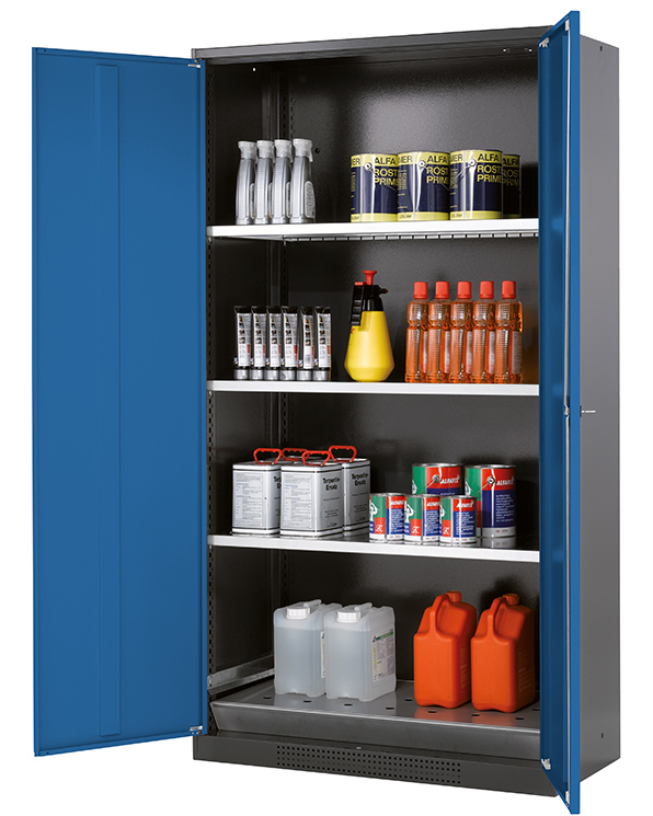 Korpusfarve antracitgrå (RAL 7016), med fløjdøre i Ensianblå (RAL 5010), udstyret med 3 x hylde, 1 x hulplade indsats, 1 x bundkar (stålplade galvaniseret)