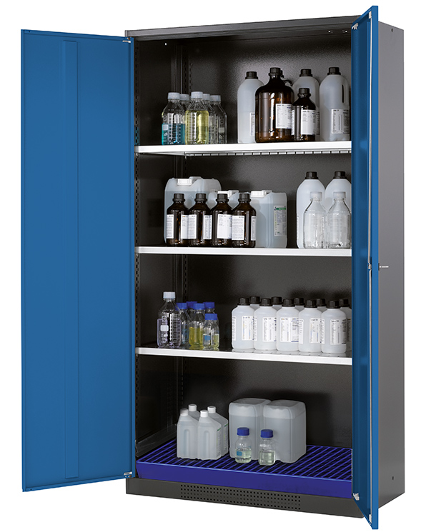 Korpusfarve antracitgrå (RAL 7016), med fløjdøre i Ensianblå (RAL 5010), udstyret med 3 x hylde, 1 x Bundkar med gitterrist (stålplade galvaniseret og lakeret)