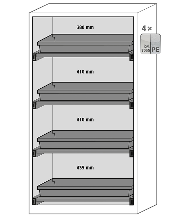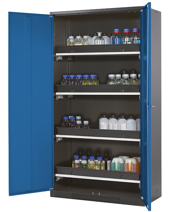 Korpusfarve antracitgrå (RAL 7016), med fløjdøre i Ensianblå (RAL 5010), udstyret med 4 x udtrækskar (stålplade/polypropylen pulver lakeret)