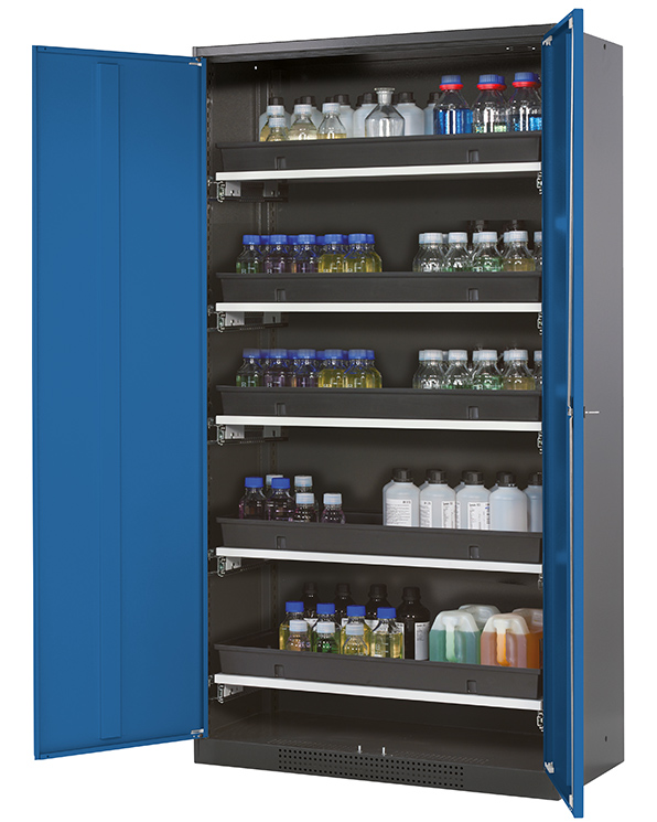 Korpusfarve antracitgrå (RAL 7016), med fløjdøre i Ensianblå (RAL 5010), udstyret med 5 x udtrækskar (stålplade/polypropylen pulver lakeret)