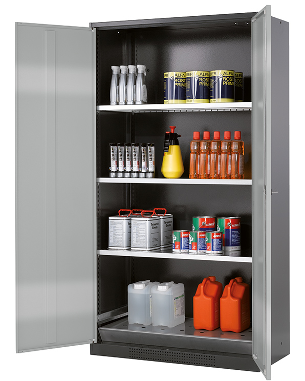 Korpusfarve antracitgrå (RAL 7016), med fløjdøre i asecos sølv, udstyret med 3 x hylde, 1 x hulplade indsats, 1 x bundkar (stålplade galvaniseret)