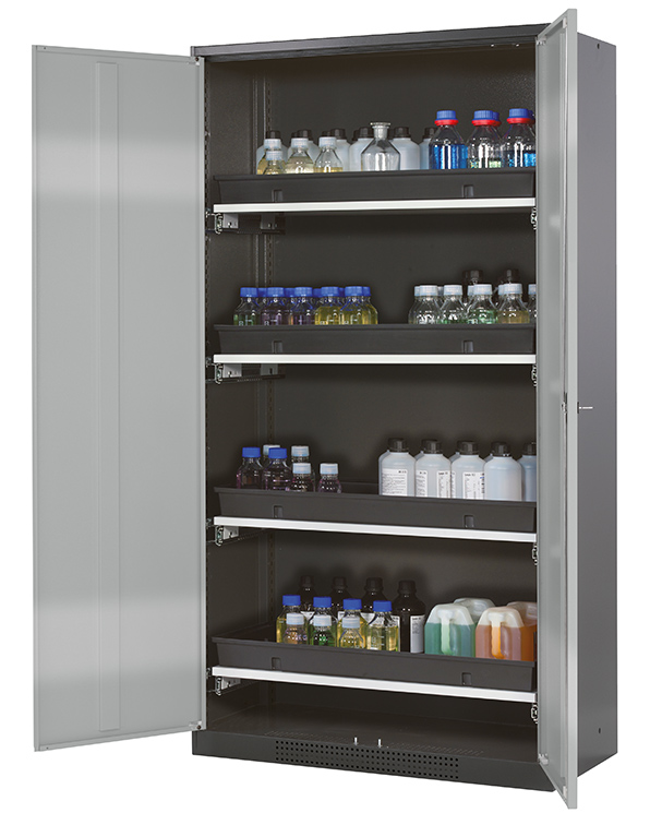 Korpusfarve antracitgrå (RAL 7016), med fløjdøre i asecos sølv, udstyret med 4 x udtrækskar (stålplade/polypropylen pulver lakeret)