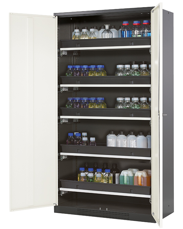 Korpusfarve antracitgrå (RAL 7016), med fløjdøre i asecos sølv, udstyret med 5 x udtrækskar (stålplade/polypropylen pulver lakeret)