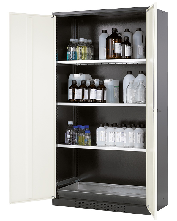 Korpusfarve antracitgrå (RAL 7016), med fløjdøre i Ren hvid (RAL 9010), udstyret med 3 x hylde, 1 x bundkar (stålplade galvaniseret)