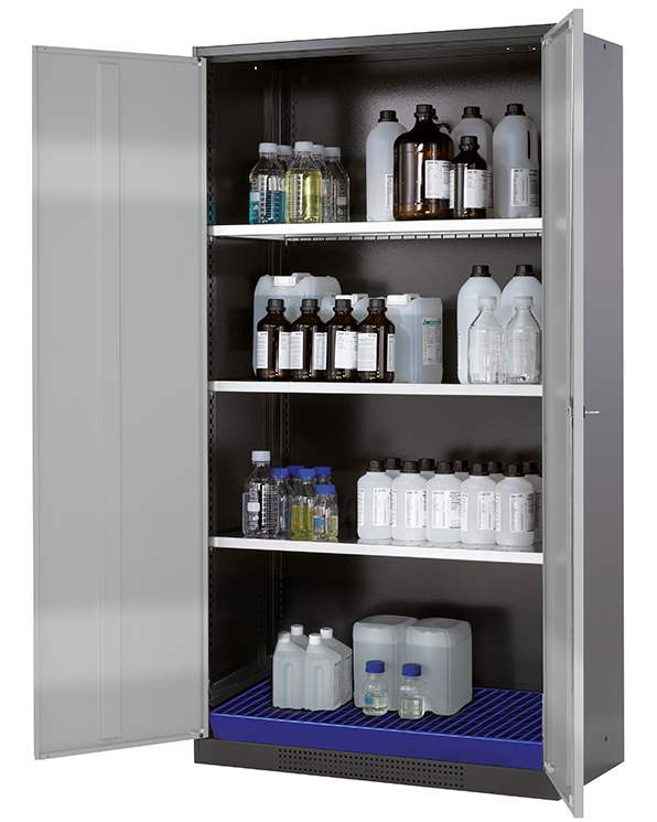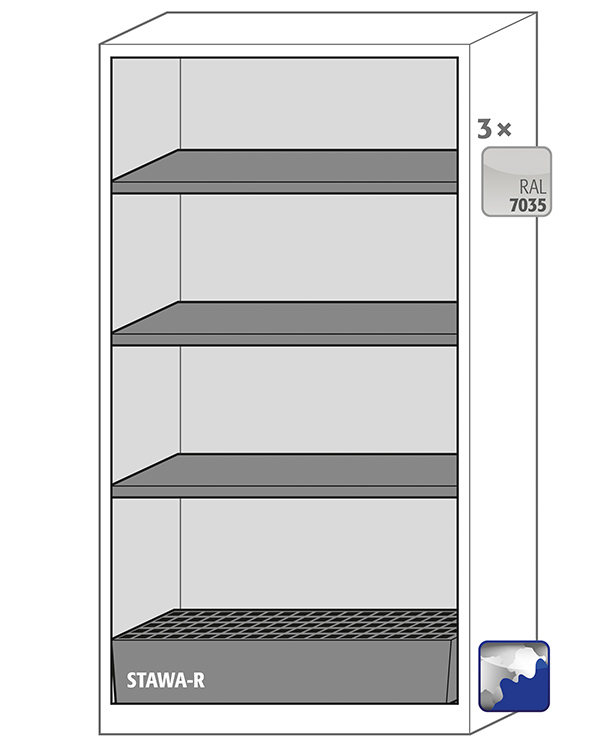 Korpusfarve antracitgrå (RAL 7016), med fløjdøre i Ren hvid (RAL 9010), udstyret med 3 x hylde, 1 x Bundkar med gitterrist (stålplade galvaniseret og lakeret)