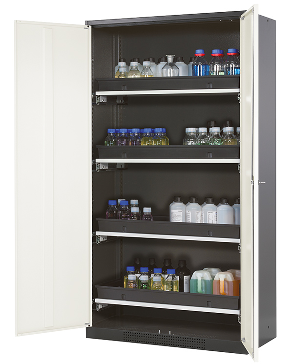 Korpusfarve antracitgrå (RAL 7016), med fløjdøre i Ren hvid (RAL 9010), udstyret med 4 x udtrækskar (stålplade/polypropylen pulver lakeret)