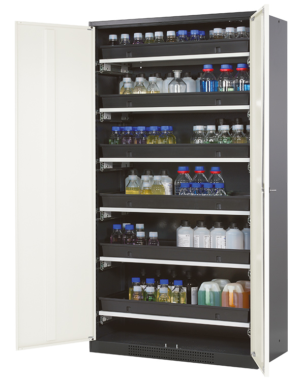 Korpusfarve antracitgrå (RAL 7016), med fløjdøre i Ren hvid (RAL 9010), udstyret med 6 x udtrækskar (stålplade/polypropylen pulver lakeret)