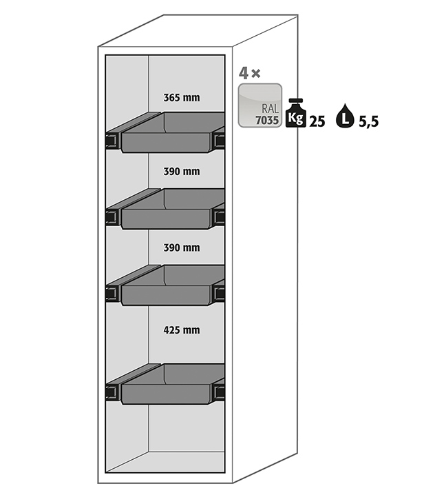 Lys grå (RAL 7035), udstyret med 4 x skuffe (stålplade pulver lakeret)
