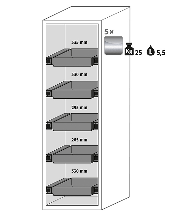 Lys grå (RAL 7035), udstyret med 5 x skuffe (rustfrit stål 1.4301)