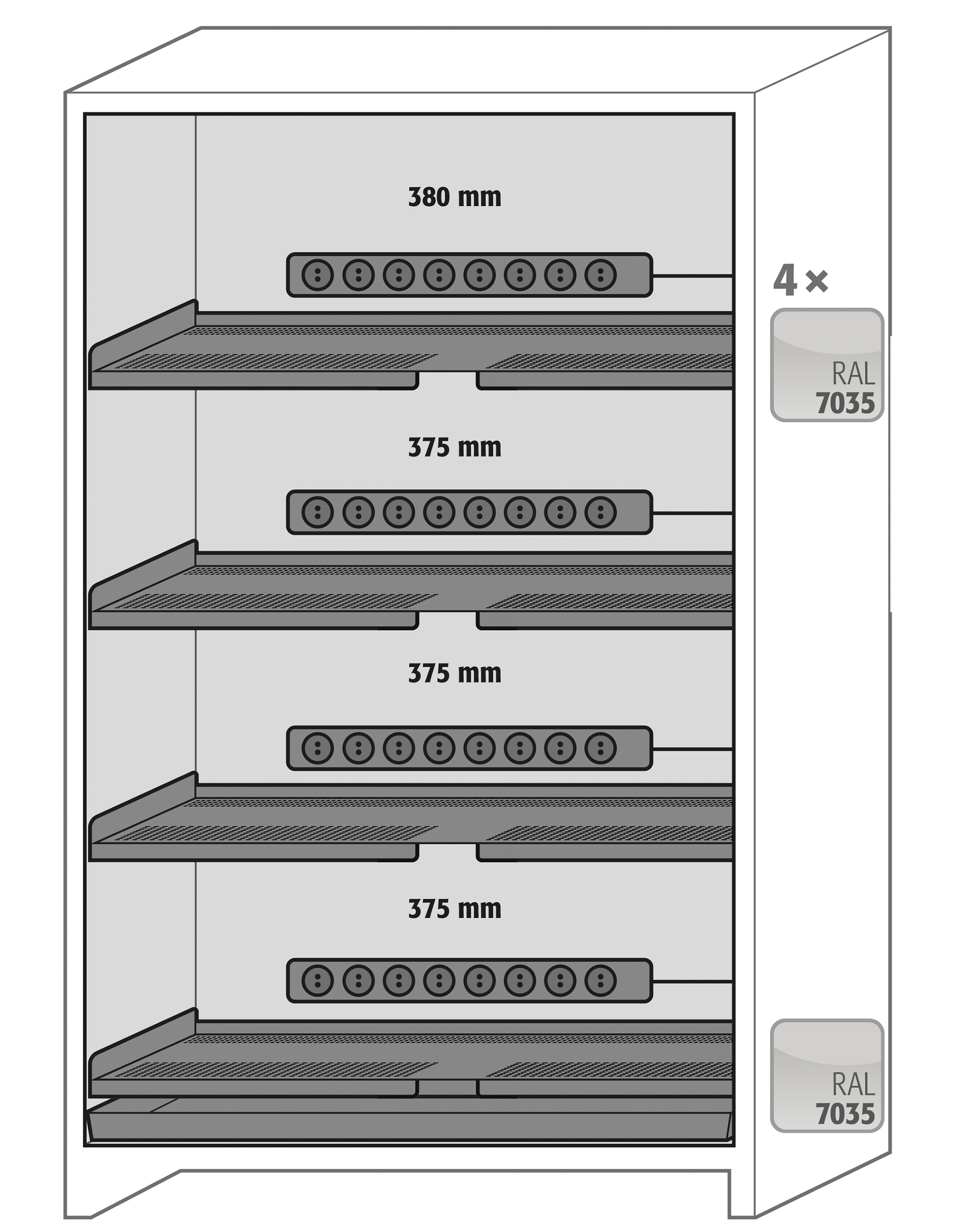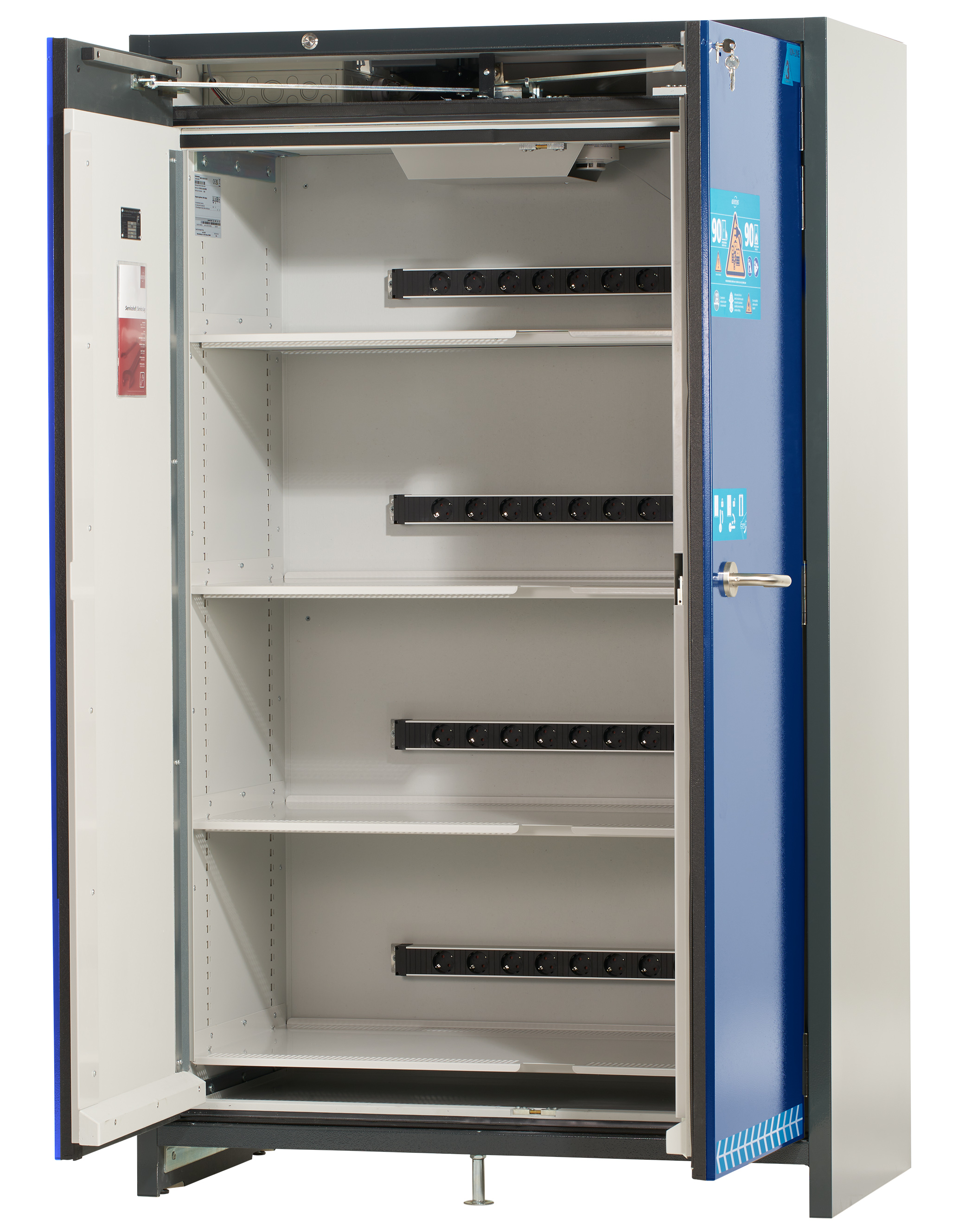 Korpusfarbe Anthrazitgrau (RAL 7016), mit Flügeltüren in Enzianblau (RAL 5010), Inneneinrichtung mit 4 x Steckdosenleiste (), 4 x Fachboden isoliert, 1 x Bodenauffangwanne (Stahlblech pulverbeschichtet)