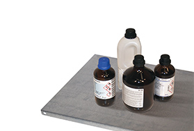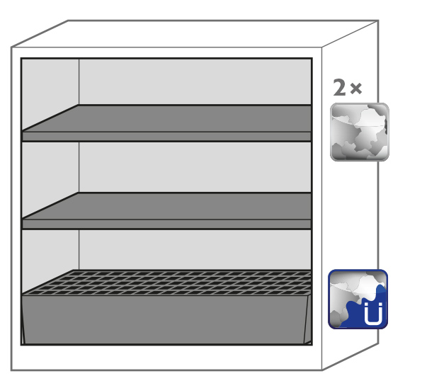 Korpusfarbe Anthrazitgrau (RAL 7016), mit Falttüren in Verkehrsrot (RAL 3020), Inneneinrichtung mit 2 x Fachboden, 1 x Bodenauffangwanne mit Gitterrost (Stahlblech verzinkt und lackiert)