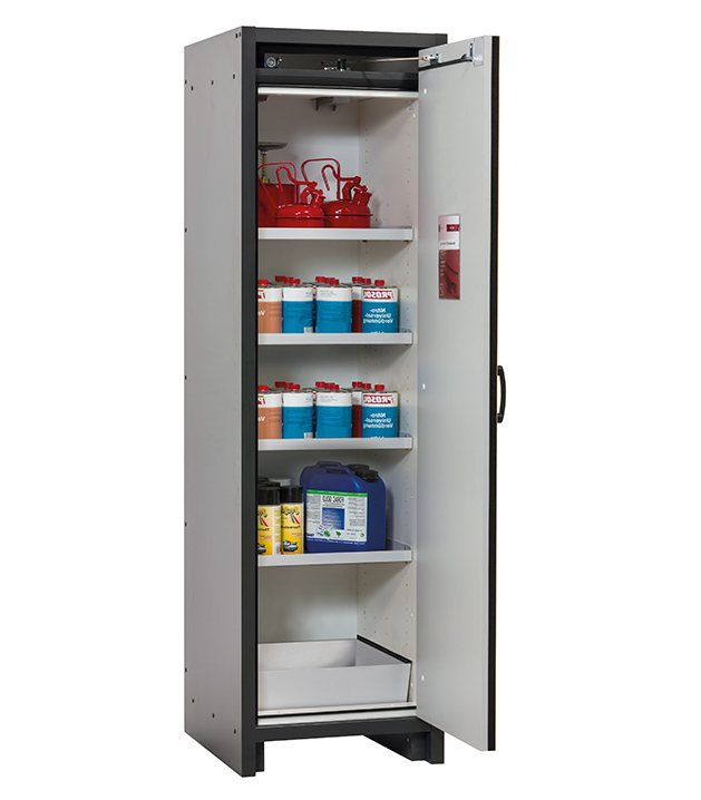Korpusfarbe Anthrazitgrau, mit Flügeltür in Sicherheitsgelb (RAL 1004), Inneneinrichtung mit 4 x Fachboden, 1 x Bodenauffangwanne (Stahlblech pulverbeschichtet)