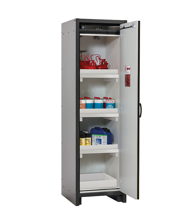 Korpusfarbe Anthrazitgrau, mit Flügeltür in Sicherheitsgelb (RAL 1004), Inneneinrichtung mit 3 x Wannenboden, 1 x Bodenauffangwanne (PP)