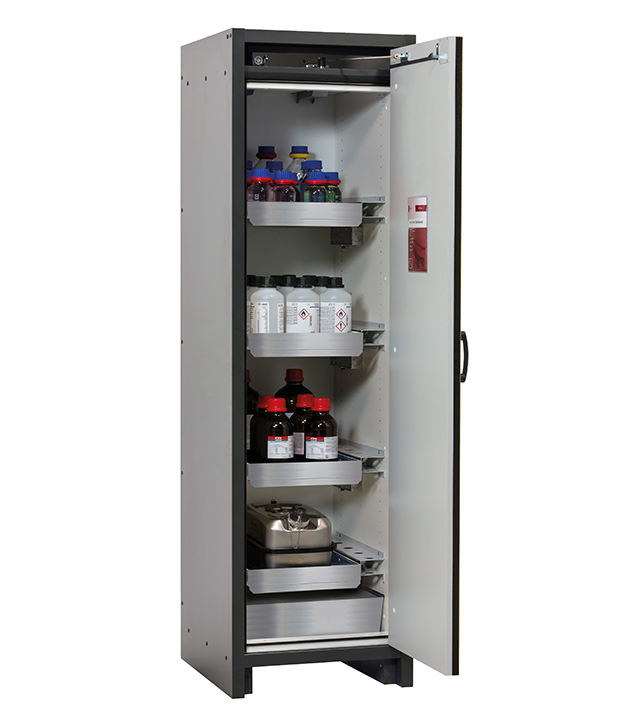 Korpusfarbe Anthrazitgrau, mit Flügeltür in Sicherheitsgelb (RAL 1004), Inneneinrichtung mit 3 x Auszugswanne, 1 x Auszugswanne Entsorgung (Edelstahl 1.4301), 1 x Bodenauffangwanne (Edelstahl 1.4016)