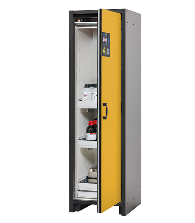 Korpusfarbe Anthrazitgrau, mit Flügeltür in Sicherheitsgelb (RAL 1004), Inneneinrichtung mit 3 x Auszugswanne, 1 x Bodenauffangwanne (Stahlblech pulverbeschichtet)