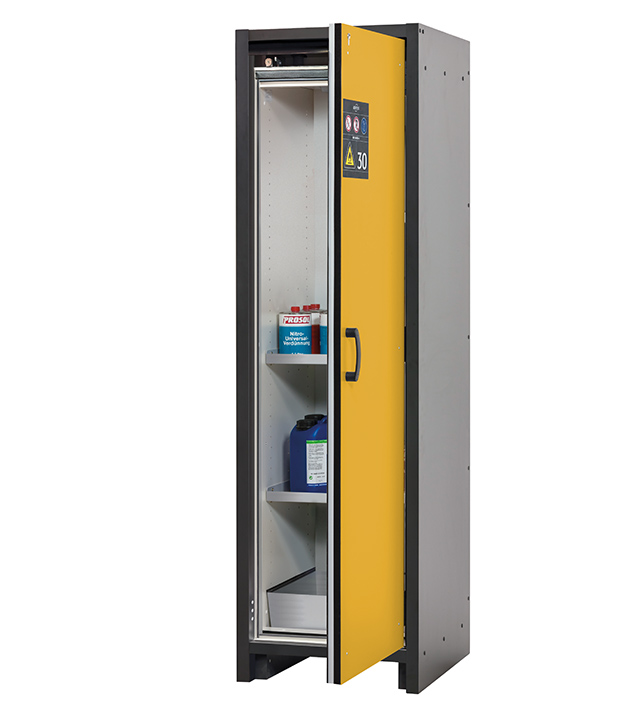 Korpusfarbe Anthrazitgrau, mit Flügeltür in Sicherheitsgelb (RAL 1004), Inneneinrichtung mit 2 x Fachboden, 1 x Bodenauffangwanne (Stahlblech pulverbeschichtet)