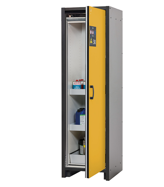 Korpusfarbe Anthrazitgrau, mit Flügeltür in Sicherheitsgelb (RAL 1004), Inneneinrichtung mit 2 x Wannenboden, 1 x Lochblecheinsatz, 1 x Bodenauffangwanne (Stahlblech pulverbeschichtet)