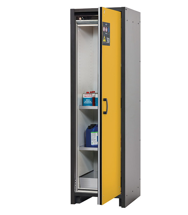 Korpusfarbe Anthrazitgrau, mit Flügeltür in Sicherheitsgelb (RAL 1004), Inneneinrichtung mit 2 x Fachboden (Edelstahl 1.4301), 1 x Bodenauffangwanne (Edelstahl 1.4016)