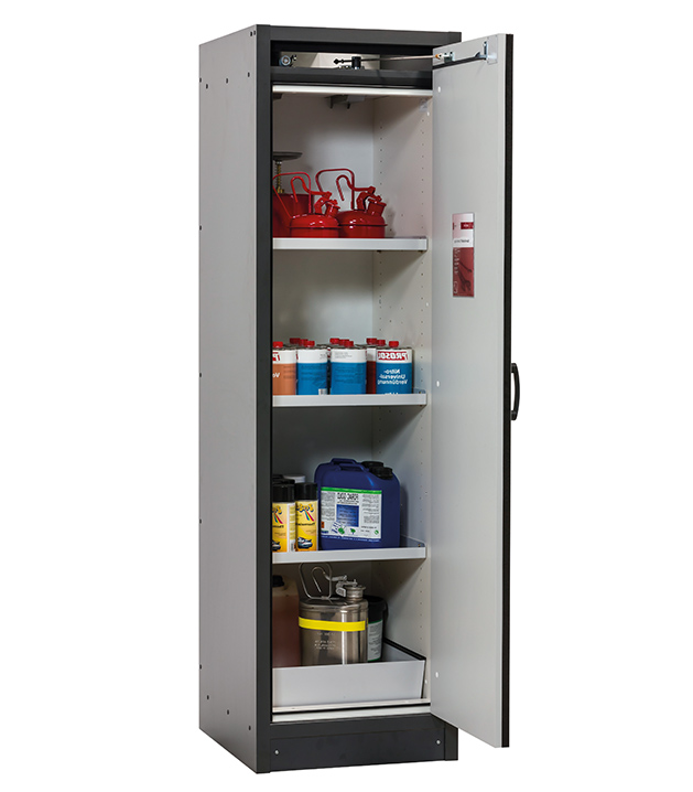 Korpusfarbe Anthrazitgrau, mit Flügeltür in Lichtgrau (RAL 7035), Inneneinrichtung mit 3 x Fachboden, 1 x Lochblecheinsatz, 1 x Bodenauffangwanne (Stahlblech pulverbeschichtet)