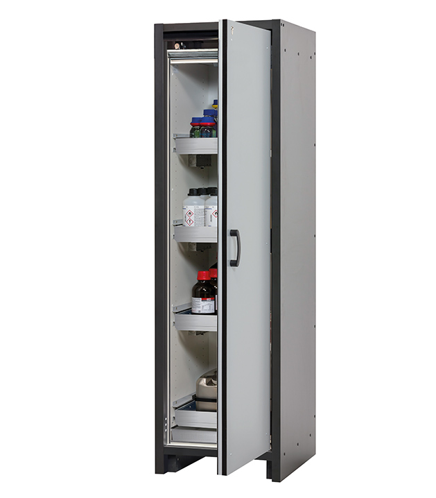 Korpusfarbe Anthrazitgrau, mit Flügeltür in Lichtgrau (RAL 7035), Inneneinrichtung mit 4 x Auszugswanne (Edelstahl 1.4301), 1 x Bodenauffangwanne (Edelstahl 1.4016)