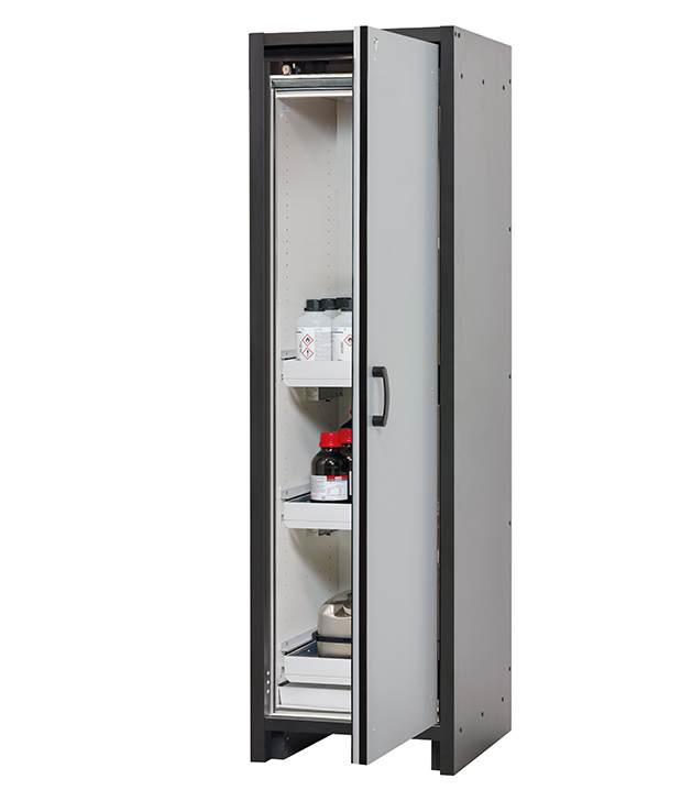 Korpusfarbe Anthrazitgrau, mit Flügeltür in Lichtgrau (RAL 7035), Inneneinrichtung mit 3 x Auszugswanne, 1 x Bodenauffangwanne (Stahlblech pulverbeschichtet)