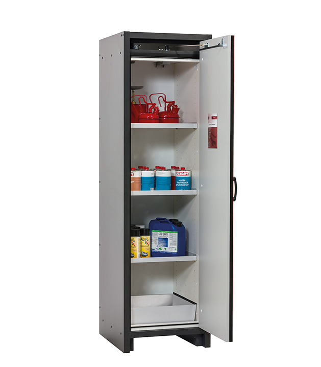 Korpusfarbe Anthrazitgrau, mit Flügeltür in Verkehrsrot (RAL 3020), Inneneinrichtung mit 3 x Fachboden, 1 x Bodenauffangwanne (Stahlblech pulverbeschichtet)