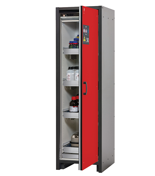 Korpusfarbe Anthrazitgrau, mit Flügeltür in Verkehrsrot (RAL 3020), Inneneinrichtung mit 4 x Auszugswanne (Edelstahl 1.4301), 1 x Bodenauffangwanne (Edelstahl 1.4016)