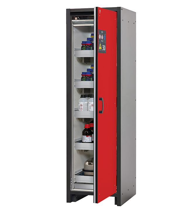 Korpusfarbe Anthrazitgrau, mit Flügeltür in Verkehrsrot (RAL 3020), Inneneinrichtung mit 5 x Auszugswanne (Edelstahl 1.4301), 1 x Bodenauffangwanne (Edelstahl 1.4016)