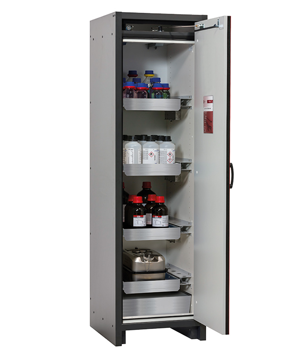 Korpusfarbe Anthrazitgrau, mit Flügeltür in Verkehrsrot (RAL 3020), Inneneinrichtung mit 3 x Auszugswanne, 1 x Auszugswanne Entsorgung (Edelstahl 1.4301), 1 x Bodenauffangwanne (Edelstahl 1.4016)