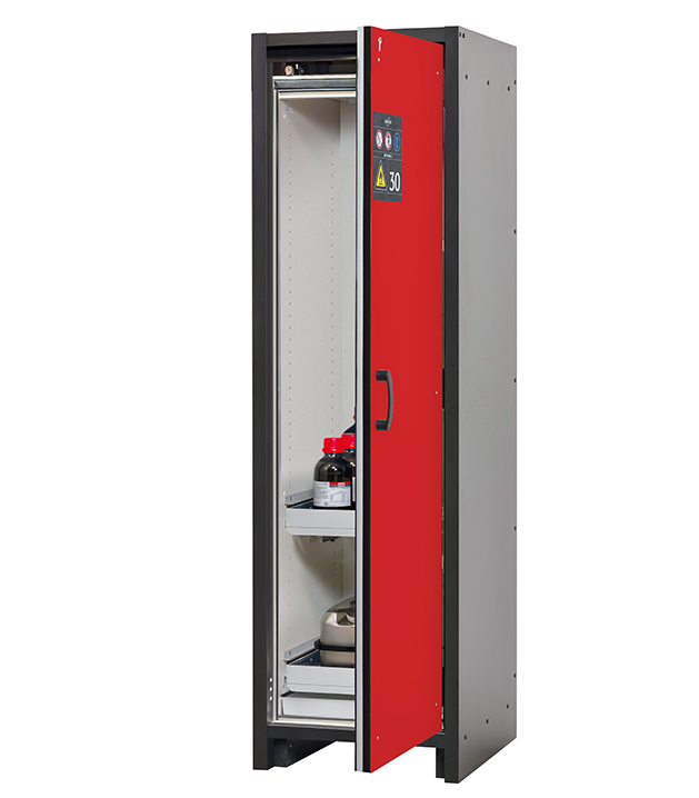Korpusfarbe Anthrazitgrau, mit Flügeltür in Verkehrsrot (RAL 3020), Inneneinrichtung mit 2 x Auszugswanne, 1 x Bodenauffangwanne (Stahlblech pulverbeschichtet)