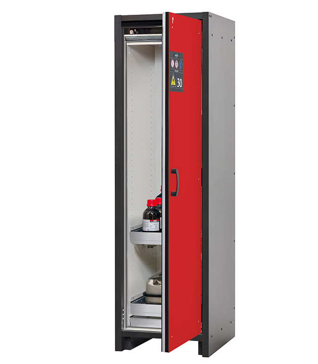 Korpusfarbe Anthrazitgrau, mit Flügeltür in Verkehrsrot (RAL 3020), Inneneinrichtung mit 2 x Auszugswanne (Edelstahl 1.4301), 1 x Bodenauffangwanne (Edelstahl 1.4016)