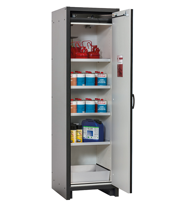 Korpusfarbe Anthrazitgrau, mit Flügeltür in Enzianblau (RAL 5010), Inneneinrichtung mit 4 x Fachboden, 1 x Bodenauffangwanne (Stahlblech pulverbeschichtet)