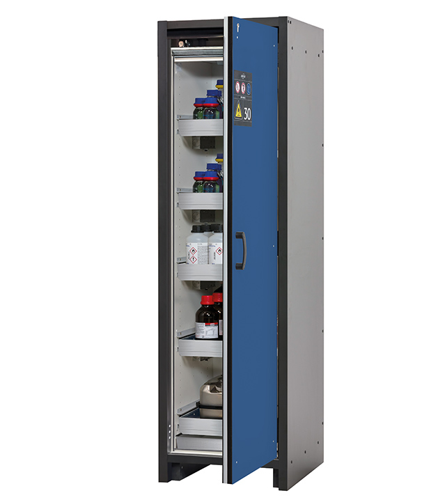 Korpusfarbe Anthrazitgrau, mit Flügeltür in Enzianblau (RAL 5010), Inneneinrichtung mit 5 x Auszugswanne (Edelstahl 1.4301), 1 x Bodenauffangwanne (Edelstahl 1.4016)
