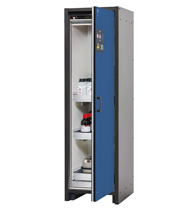 Korpusfarbe Anthrazitgrau, mit Flügeltür in Enzianblau (RAL 5010), Inneneinrichtung mit 3 x Auszugswanne (Edelstahl 1.4301), 1 x Bodenauffangwanne (Edelstahl 1.4016)
