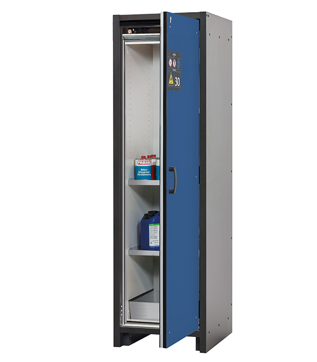 Korpusfarbe Anthrazitgrau, mit Flügeltür in Enzianblau (RAL 5010), Inneneinrichtung mit 2 x Fachboden, 1 x Bodenauffangwanne (Stahlblech pulverbeschichtet)
