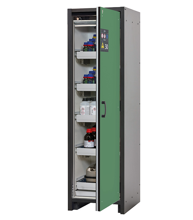 Korpusfarbe Anthrazitgrau, mit Flügeltür in Resedagrün (RAL 6011), Inneneinrichtung mit 5 x Auszugswanne, 1 x Bodenauffangwanne (Stahlblech pulverbeschichtet)