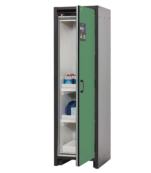 Korpusfarbe Anthrazitgrau, mit Flügeltür in Resedagrün (RAL 6011), Inneneinrichtung mit 2 x Wannenboden, 1 x Bodenauffangwanne (PP)