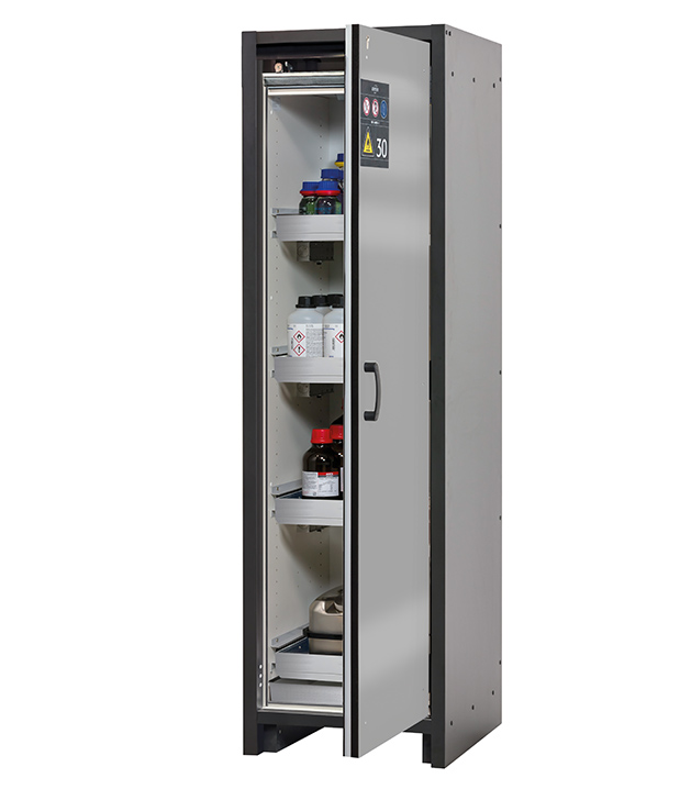 Korpusfarbe Anthrazitgrau, mit Flügeltür in asecos Silber, Inneneinrichtung mit 4 x Auszugswanne (Edelstahl 1.4301), 1 x Bodenauffangwanne (Edelstahl 1.4016)